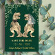 Introducing the perfect way to add a playful touch to your big day. Dinosaur Themed Wedding T-Rex Bride and Groom gold foil Save the Date Invitation. Featuring watercolor illustrations of a charming T-Rex bride and groom, this save the date wedding invitation is sure to bring smiles to your guests' faces. Gold foil script and modern typography and eucalyptus leaf foliage gold foil detailing, combines fun and elegance in one delightful design on a striking dark emerald green background.