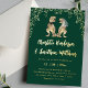Funny Dinosaur theme dark emerald green and gold foil Wedding Invitation T-Rex Bride and Groom Modern Jungle Theme