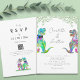If you and your partner are dino lovers, this fun and stylish dinosaur-themed wedding invitation is the perfect way to celebrate your big day! Featuring a playful T-Rex bride and groom in a vibrant mix of blue, pink, purple, green, teal, and peach, this invitation combines your love for dinosaurs with elegant botanical elements. The watercolor eucalyptus foliage and greenery bring a fresh, natural touch, while the funny T-Rex illustrations add the perfect amount of whimsy and charm.