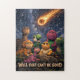 Dinosaurs with worried looks nervously staring at a blazing meteor streaking towards Earth across a star-filled night sky. “Well that can’t be good” is written in a stony prehistoric typeface. This jigsaw puzzle perfectly blends ancient history with modern wit. It makes a great gift for Dinosaur lovers, paleontology fans or anyone looking for unique, funny Dinosaur gifts. When a meteor is headed your way understatement is everything. AVailable in many sizes. Make sure to preview it before buying so it looks right.