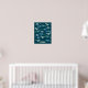 Lots of blue dinosaurs, Tyrannosaurus rex, Spinosaurus, Stegosaurus, Diplodocus and Triceratops on a dark teal green background. Change the name to personalise.