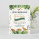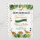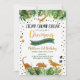 This adorable birthday invitation features tropical watercolor leaves with gold foil leaf embellishments and gold dinosaur silhouettes.