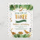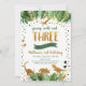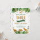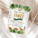 This adorable birthday invitation features tropical watercolor leaves with gold foil leaf embellishments and gold dinosaur silhouettes.