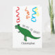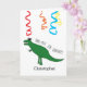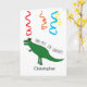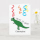 A personalised dinosaur kindergarten graduation card for kids. The front features colourful streamers and a t-rex dinosaur wearing a graduation cap holding a diploma. The front can be easily personalised with his or her name. The inside card message can also be edited and the back with the graduating year. This cute dinosaur graduation card for kids would make a great card keepsake.