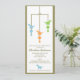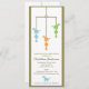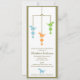 Three cute dinosaurs in blue, green, and orange hang from a mobile on this adorable baby shower invitation.