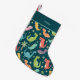 Add a custom Jurassic touch to your holiday living room decor with this monogrammed dinosaur Christmas stocking. Stocking has a pattern of colourful dinosaurs on a dark blue background and your little one's first name and monogram.