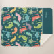 Add a custom Jurassic touch to the bedroom or nursery of your little kid with this monogrammed dinosaur sherpa blanket. Blanket has a pattern of colourful dinosaurs on a dark blue background and your little one's first name and monogram in the bottom right corner.