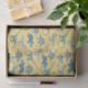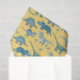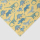 Lots of blue dinosaurs on a yellow background. Tyrannosaurus Rex, Spinosaurus, Stegosaurus, Diplodocus and Triceratops.