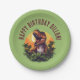 Fun kid's dinosaur themed birthday party paper plates feature T-Rex with sunset and tropical plants on green background.