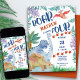 Dinosaur birthday invitation for a boy's 4th birthday. The rhyming wording reads "Roar [name] is turning Four". Watercolor dino design with cute dinosaurs in jurassic, tropical jungle setting. Please browse my store for more dinosaur birthday invites.