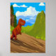 Dinosaur running down a hill with a green hill and blue sky with white cloud in the background. This is a AI generated art.