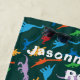 A pattern made out of seven colorful dinosaur silhouettes. There is a Tyrannosaurus Rex, a Pterodactyl, a Triceratops, a Velociraptor, a Stegosaurus, a Brontosaurus, and an Elasmosaurus. Personalize it with your dino name!
