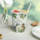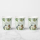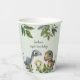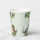 Simple but stylish dinosaur birthday themed paper cups featuring three dinosaurs ans lush green folage all on a light green background .