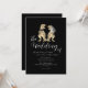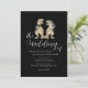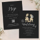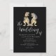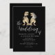 This unique black and white wedding invitation showcases an original watercolor illustration by artist Catherine Sweetman of a T-Rex bride and groom ideal for couples who love dinosaurs, Jurassic themes, or non-traditional destination wedding celebrations. The stylish sleek black background contrasts beautifully with crisp white calligraphy script and clean modern typography, creating a look that’s romantic, stylish, and fun.