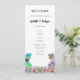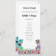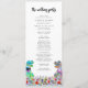 Funny dinosaur themed wedding day program with colourful T-Rex bride and groom in a beautiful prehistoric wildflower meadow. Easy to customise with the bride and grooms names, the wedding date and all the wedding day ceremony details in modern typography script. Fun Tyrannosaurus Rex bride and groom dino and watercolor wildflower illustrations in blue pink purple orange yellow red and green hues. Unique original dinosaur and floral artwork by artist Catherine Sweetman