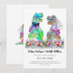 Delight you guests with this funny dinosaur themed colourful wedding invitation with T-Rex bride and groom standing in a colourful wildflower meadow. Easy to personalise with the bride and grooms names, wedding date and all the details. Fun funky dinosaur bride and groom illustrations with modern whimsical typography script. Unique original artwork by artist Catherine Sweetman