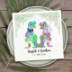 Delight your guests with these funny colourful dinosaur themed wedding napkins with fun dinosaur bride and groom and eucalyptus foliage. Easy to customise with the bride and grooms names, the wedding date in modern typography script. Colourful psychedelic T-Rex bride and groom illustrations in pink purple blue green yellow and orange hues with jungle foliage in green hues. Unique original dino artwork by artist Catherine Sweetman
