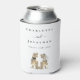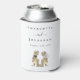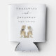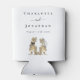 Welcome your guests with a roar of laughter and love with this funny dinosaur-themed wedding can cooler, featuring a charming watercolor illustration of a T-Rex bride and groom in soft brown and beige tones. Set against a sophisticated white background, this unique can cooler combines prehistoric charm with modern elegance.