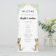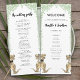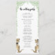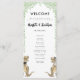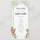 Funny dinosaur themed wedding day program with fun dinosaur bride and groom and watercolor eucalyptus foliage. Easy to customise with the bride and grooms names, the wedding date and all the wedding day ceremony details in modern typography script. T-Rex bride and groom dino illustrations in brown hues and watercolor botanical greenery in green hues. Unique original dino artwork by artist Catherine Sweetman