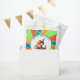 Adorable Personalised Boy's Birthday Party favours. Cute dinosaur theme in blue, orange and green. Cute cartoon dinosaurs holding balloons and birthday cake. Add name and age in the personalise area.