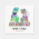 Fun dinosaur theme wedding with dinosaur bride and groom in a beautiful colourful wildflower meadow a custom dinosaur wedding napkin to delight your guests. Easy to customise with the bride and grooms names and the wedding date in modern typography script. Funny Tyrannosaurus Rex bride and groom and watercolor summer floral illustrations in purple blue pink green yellow and orange hues. Unique original dino and summer floral artwork by artist Catherine Sweetman