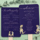 Add a touch of Jurassic fun to your big day with this funny dinosaur-themed wedding program fan, featuring a whimsical watercolor illustration of a T-Rex bride and groom in warm brown and beige hues. Set against a rich navy blue background, this unique wedding fan is the perfect blend of humor and elegance.
