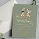 Set against a sophisticated sage green background, the design is enhanced with shimmering gold foil script and clean modern typography creating a chic, luxurious, and lighthearted look. Whether you’re planning a Jurassic-inspired wedding, a boho outdoor celebration, or simply love quirky romantic stationery, this invitation offers a beautiful way to tell your love story.
