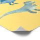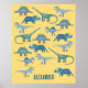 Lots of blue dinosaurs, Tyrannosaurus rex, Spinosaurus, Stegosaurus, Diplodocus and Triceratops on a sunny yellow background. Change the name to personalise.