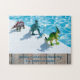 This is a personalised jigsaw puzzle with a line of colourful dinosaurs beside a bright blue pool. It is perfect to give on a birthday or other occasions with a personalised message.