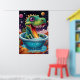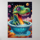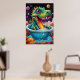 This dinosaur could belong to an imagined species from a cosmic realm, where flora and fauna thrive in vibrant, psychedelic ecosystems, blending prehistoric life with a space-age twist. Its demeanour exudes innocence and wonder, as though it’s exploring its fantastical universe for the first time.