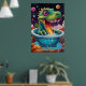 Whimsical and vibrant dinosaur that seems to be a blend of fantasy and prehistoric charm. The dinosaur has a long neck and a large head, featuring a wide-eyed expression with captivating, oversized eyes that give it a cute and curious look. Its skin is adorned with intricate patterns resembling colourful, swirling shapes and dots, almost as if its body is painted with a kaleidoscope of textures in blues, greens, yellows, and purples. The vibrant background, with its swirling skies and abstract planets, gives the impression of an otherworldly landscape, suggesting the dinosaur resides in a surreal, fantastical world. The bright, exaggerated colours and playful features give the creature a friendly, animated character, ideal for a magical or dreamlike setting.