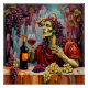 The A.I. created interpretation from my description of Dionysus, the ancient Greek god of wine is depicted holding a glass of red wine, appearing to contemplate its contents amidst an abundant spread of grapes. Dressed in a draped red garment, the character sits at a table set against a backdrop of grapevines and draped foliage.