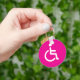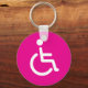 Keychain or keyring featuring a white and hot pink disabled sign or handicap symbol with a handicapped man sitting down in a wheelchair. Girly version of the classic symbol used for handicap parking, toilets for disabled and handicapped persons and more. Also available in other colours.