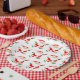 Creative disc golf Christmas holiday party plates featuring Santa Claus with a disc.