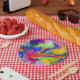 Cool colourful disco balls in an array of colours modern digital pour painting fluid art Birthday party paper plates.