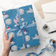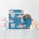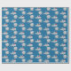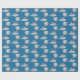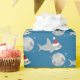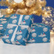 Christmas wrapping paper featuring with cute, smiling, sharks in Santa hats that are carrying disco balls in a repeat pattern on a blue background.