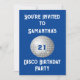 Disco Party Retro Birthday Fun Invitation—Any Age. For Her Or Him. Can Be Customised. Blue and Silver With Vintage Text. Funny Bokeh Glitter Disco Ball Theme. Ideal for Birthdays, Anniversaries, and Graduations.