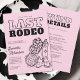 Disco Cowgirl Bachelorette Party Weekend Itinerary Invitation features bold black outlined text, a disco ball, western boots, and a cow print cowgirl hat, all on a light pink background. Perfect for celebrating the bride’s final ride with a country chic Nashville weekend or girls' trip. The backside includes a full weekend schedule to keep your bride tribe on track. Personalise with your party details and get ready to saddle up!