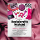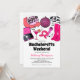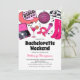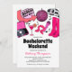 Space cowgirl bachelorette party invitations featuring a selection of retro pink items such as a disco ball, record player, cowgirl boots, mic, cocktails, and rodeo hat, plus a modern fun bachelorette template that is easy to personalise including a weekend itinerary on the back.