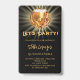 A modern, stylish and glamourous badge for a Quinceañera, 15th birthday party. Disco party birthday invitation. A black background deecorated with a golden disco ball. Text: Let's Party! Personalise and add a name and party details. The name is written with a hand lettered style script.