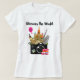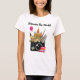 A t-shirt with a graphic illustration featuring European landmarks such as leaning tower of Pisa, Big Ben, Eiffel Tower etc... A hot air balloon in the sky and a double decker bus, with a large camera. A stamp with the Egyptian pyramids stuck to the camera.