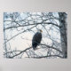 A photograph of a Bald Eagle sitting on a tree branch, looking to one side, with having a piece of fish dangling from it's beak. The bird appears to have a furrowed brow, indicating it has disgust for whomever disturbed it. The tree that the eagle is perched in has no leaves as the photographed scene was in winter. Image Copyright ©2021 Kimberly J Tilley.