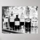 Black and white vintage photo of a display of labelled apothecary bottles containing drugs such as Castor Oil, Tr. Scillae, El. Calisayae, and tinctures of Belladonna, Opium, and Digitalis. Photo c. 1940, courtesy of the LOC