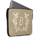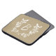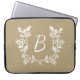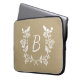 Rustic laptop sleeve with white floral wreath and custom monogram on distressed beige background.
