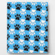A pattern in black and white of dog paw prints with distressed effects on a blue background.