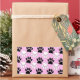 A pattern in black and white of dog paw prints with distressed effects on a pink background.