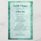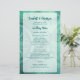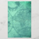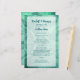 Budget wedding menu template in free with distressed green paper. This layered-look paper has a map, moth and splatter background in teal green. Dark green text is printed over a transparent white panel with places for first names of the couple, date, location, menu title and list of menu items. The paper is very affordable, with discounts for bulk orders.