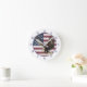 A majestic bald eagle has outstretched wings and bared claws on this patriotic clock. The eagle image is set against a portion of a distressed USA flag. Navy blue numbers around the white perimeter border make the clock easy to read.