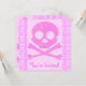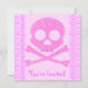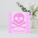 Custom two-sided invitation cards. Front has customisable "You're Invited". Back has invitation information--enter your event title, date, time, location, and additional info or personal message. Pink skull and crossbones, with lavender eye patch with a pink heart, and a lavender bandanna with a heart pattern. Cute pink pirate skull.