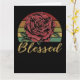 Send this distressed vintage-style greeting card with your own personalised message on the front and back. Features a classic red rose in front of a distressed retro sunset background and the word "Blessed" in gold font.